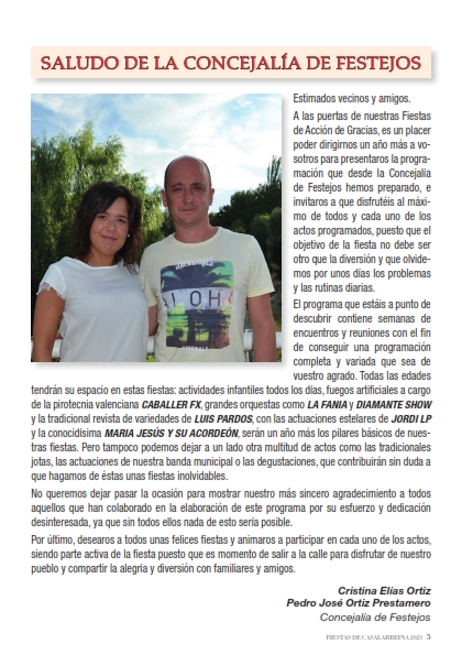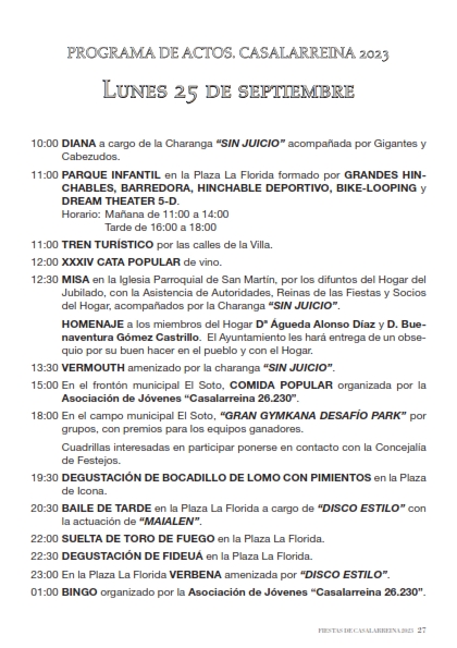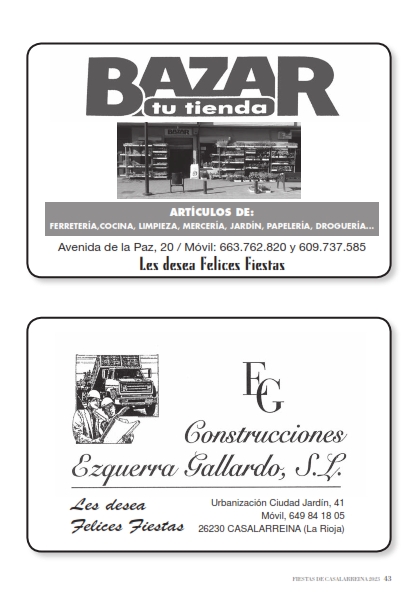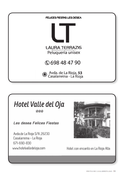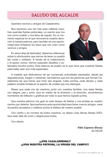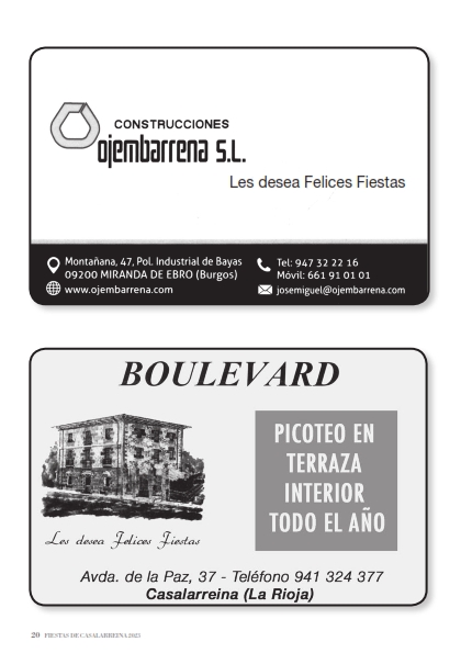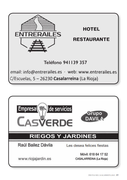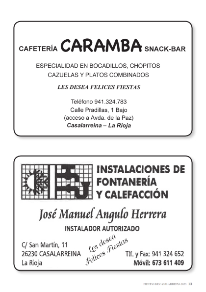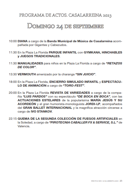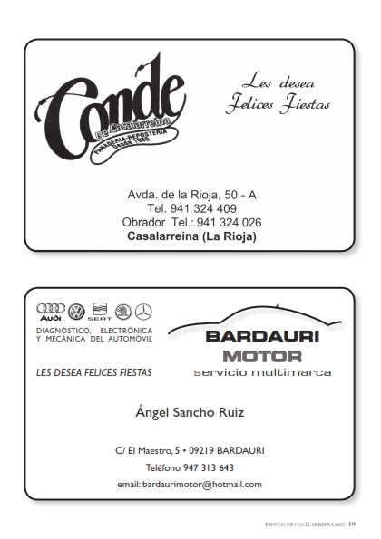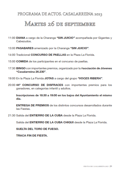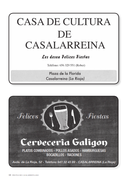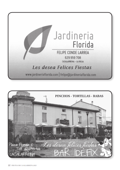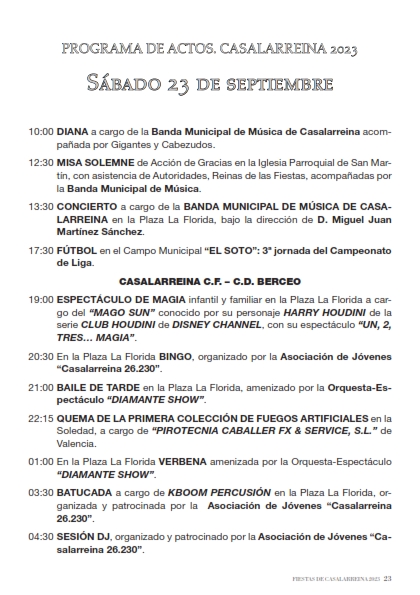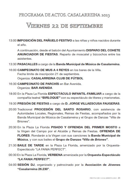 Programa Oficial de Fiestas 2023 Publicación de la entrada:19 septiembre, 2023 Categoría de la entrada:General Etiquetas: casalarreina, FIESTAS ¿Te ha gustado? Compártelo Compartir este contenido Se abre en una nueva ventana Se abre en una nueva ventana Se abre en una nueva ventana Se abre en una nueva ventana También podría gustarte San Vitores 2022 24 agosto, 2022 Suplemento Fiestas de Casalarreina en La Rioja ;) 26 septiembre, 2019 Ludoteca de verano 2023 26 junio, 2023