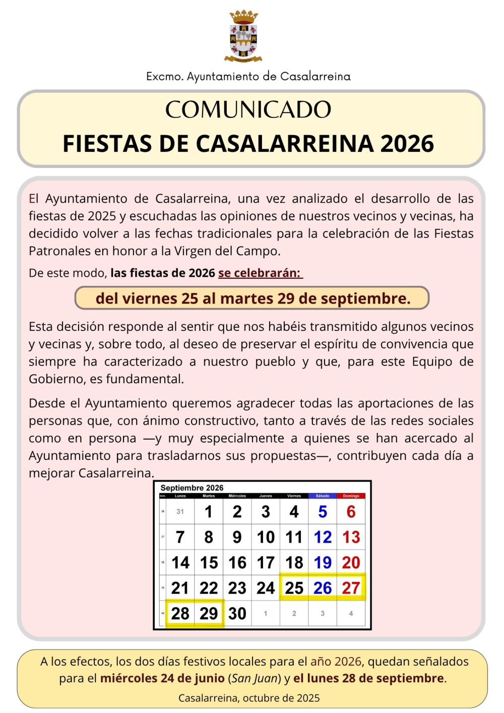 COMUNICADO FIESTAS SEPTIEMBRE 2026